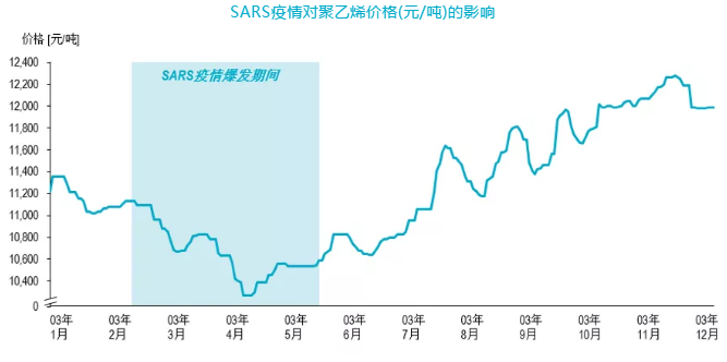 以2013年SARS疫情為參考,在4月中旬到5月中旬SARS疫情較為嚴(yán)重的時(shí)期,聚乙烯價(jià)格出現(xiàn)了持續(xù)下跌行情,疫情結(jié)束后聚乙烯價(jià)格逐漸恢復(fù),到六月初回到疫情爆發(fā)前的價(jià)格區(qū)間并進(jìn)入上漲行情。