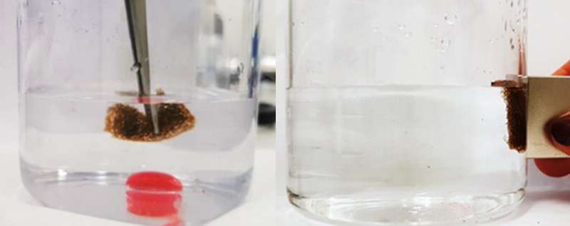 “第二個(gè)問題是找到一種有效的方法,從水中去除這種物質(zhì)。我們選擇了磁性吸附劑系列。我們?cè)诤>d的結(jié)構(gòu)中加入了鐵納米粒子,這是通過我們?cè)挤椒ǐ@得的,其特征是對(duì)非極性分子的敏感性增加。我們還添加了疏水性有機(jī)基團(tuán)。結(jié)果,我們得到的材料幾乎不與水相互作用,盡管它是一塊海綿,”這位科學(xué)家解釋說。
