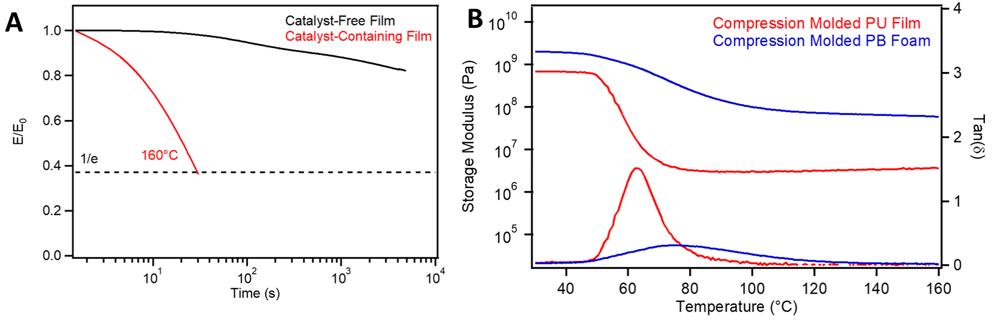 為了確定DBTDL的添加在PU處理中的作用,研究人員使用無催化劑的PU膜進行了對比測試。圖2的應力松弛分析結果顯示,經DBTDL催化劑處理得到的薄膜可迅速恢復應力,在處理過程中會經歷快速的動態(tài)轉換;而無催化劑的薄膜松弛應力要慢得多,并且顯示出較差的可再加工性,表明DBTDL催化劑的使用促進了PU泡沫的再處理。