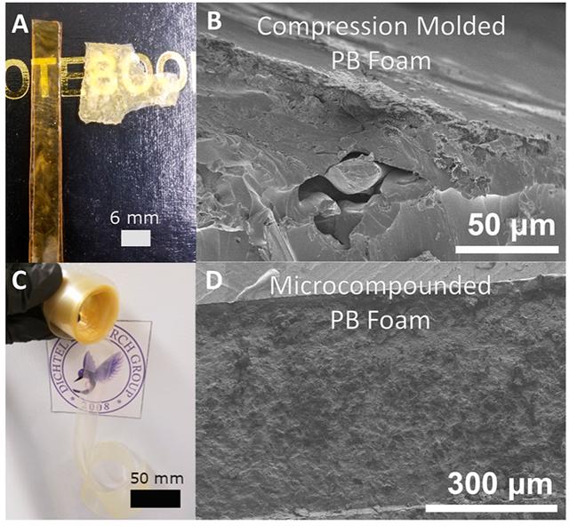 圖3顯示了研究人員通過傳統(tǒng)壓縮模塑法和雙螺桿擠出法對PU泡沫再處理的對比,可以看出壓縮模塑法對PU泡沫的后處理效果較差,而通過雙螺桿擠出機則能夠有效地將泡沫中的空氣去除,得到具有優(yōu)異機械性能的材料;SEM表征結果也明顯看出,與壓縮模塑相比,雙螺桿擠出機得到的材料質地均勻,不存在明顯的空隙。